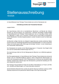 Stellenausschreibung 19/2026 Im Geschäftsbereich des Thüringer Finanzministeriums wird der Dienstposten der Amtsleitung (m/w/div) des Finanzamtes Eisenach ausgeschrieben. Die Ausschreibung richtet… mehr