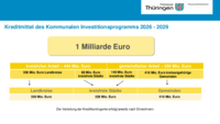 Kreditmittel des Kommunalen Investitionsprogramms 2026 - 2029 1 Milliarde Euro kreislicher Anteil – 444 Mio. Euro 356 Mio. Euro Landkreise gemeindlicher Anteil – 556 Mio. Euro 88 Mio. Euro… mehr